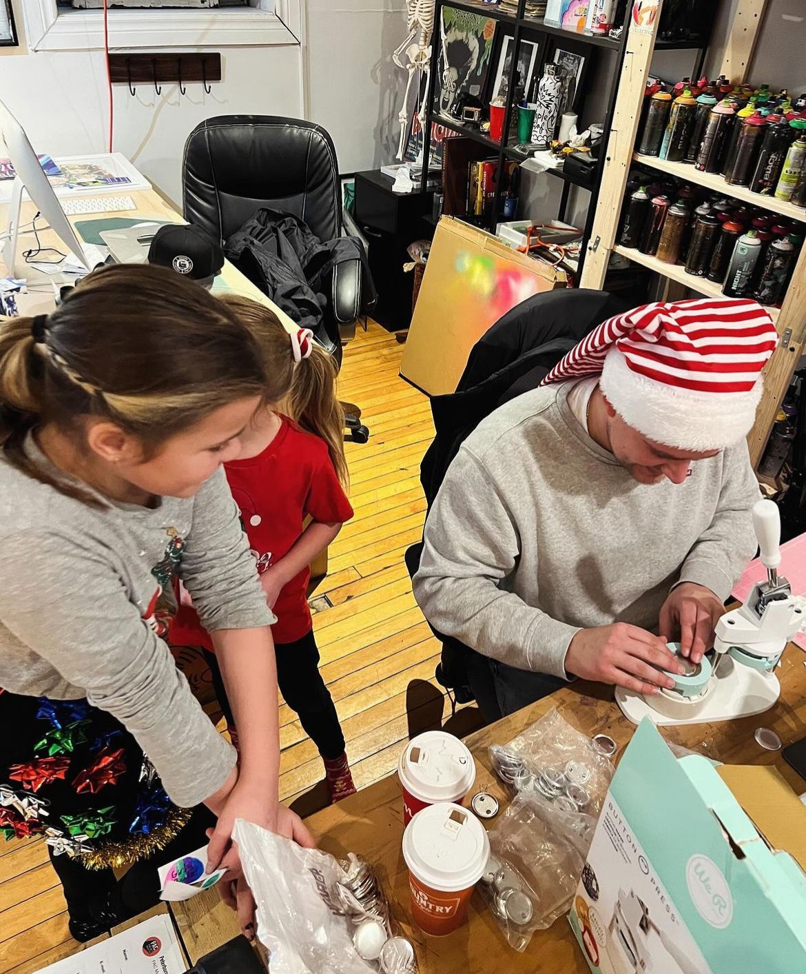 Left: Some of the group from the workshop. Middle-Left: Nick making buttons with the kids. Middle-Right: One of the attendees making their ornament Right: Putting the finishing touches on the ornament by adding the ribbon.